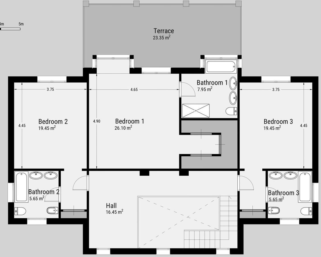 Upstairs, the luxurious master suite features a private terrace with open sea views, a generous en-suite bathroom and ample wardrobe space. Two additional en-suite guest bedrooms ensure privacy and comfort for family and guests.