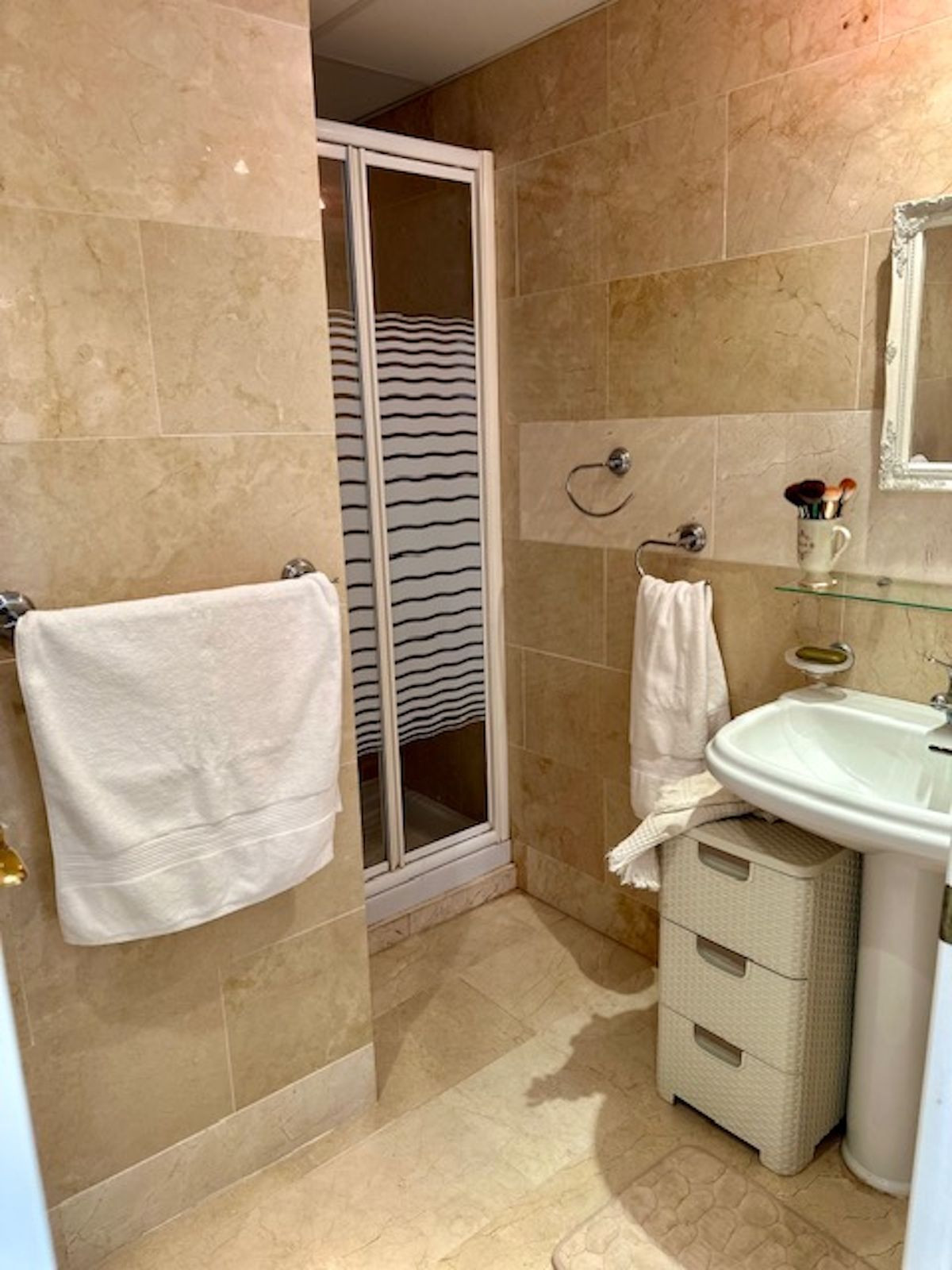 Spacious entrance hall, with a kitchen to the right overlooking the complex and exceptionally bright, with windows and natural light. The laundry area off the kitchen has been converted into a bedroom with a 90-cm bed. This makes it an option for an additional guest!