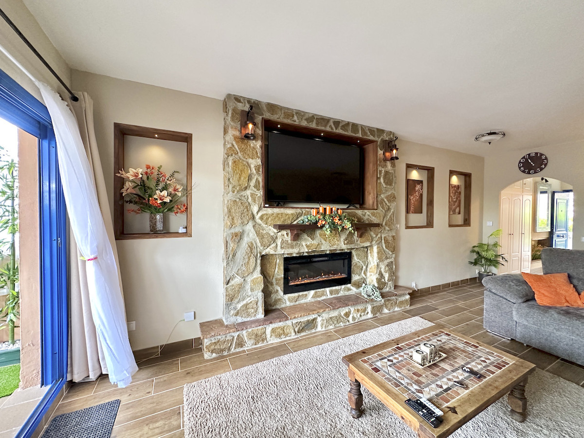 The apartment comprises two well-proportioned bedrooms and two modern bathrooms, including a stylish en-suite, as well as a guest toilet for added convenience. The open plan, fully fitted kitchen is equipped with high-quality appliances and is complemented by a separate utility and laundry room. The dining area flows seamlessly into the living space, which features a welcoming fireplace and direct access to the covered terrace, ideal for alfresco dining or relaxing in the Mediterranean climate. The property is offered fully furnished, with optional furniture packages available, and is in excellent, recently renovated condition.
