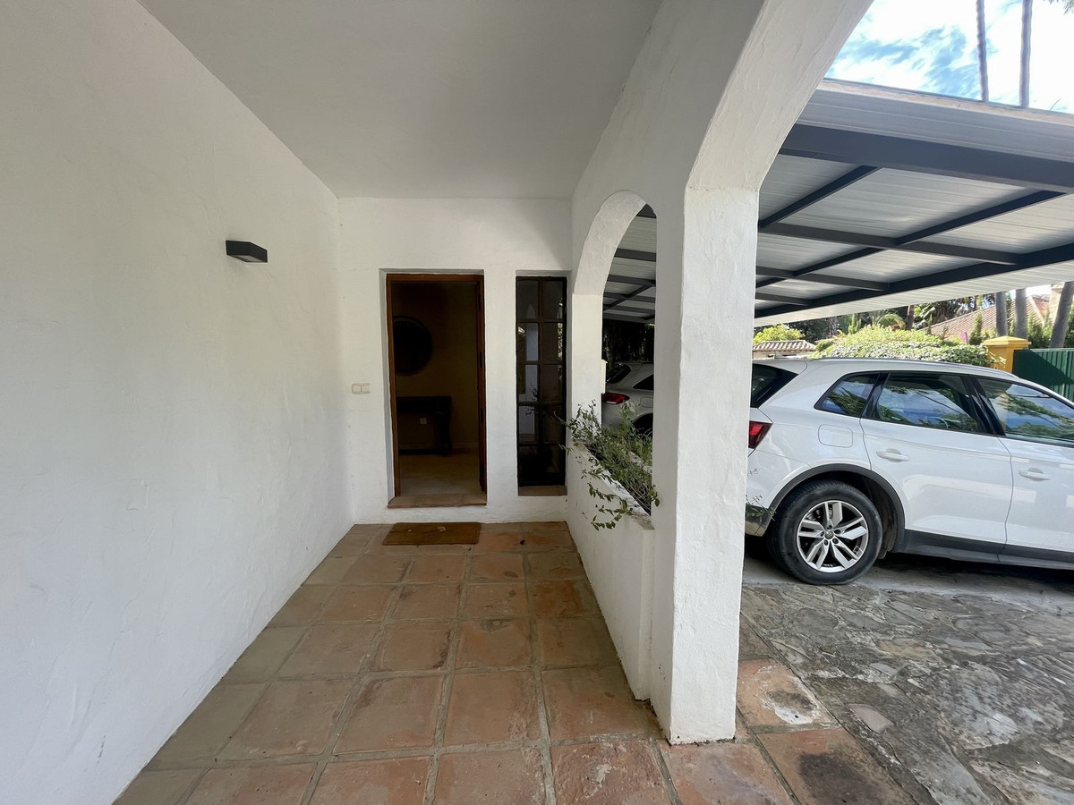 Additional features include a covered carport for two cars and a private gated entrance shared only by the few properties on this street, located within the larger 24-hour security macro-community of Sotogrande