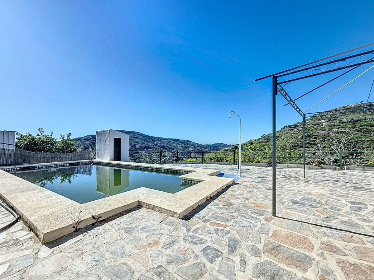 Nestled in the gentle hills below Cómpeta, with sweeping views of the surrounding mountains, this charming country house in traditional Andalusian style offers a peaceful retreat for nature lovers and those seeking tranquility. The single-storey house features a cosy living and dining area with an adjoining, typically Andalusian kitchen. Three bedrooms, one bathroom, and a separate guest WC provide comfortable space for family or friends. Underfloor heating and air conditioning in the main rooms ensure comfort all year round whether on hot summer days or cooler winter nights. Outside, a spacious covered terrace invites you to relax, while the refreshing pool, additional guest WC, and a small, built-in summer kitchen create the perfect setting for outdoor living and entertaining. The property is set on a natural plot with various fruit trees a beautiful frame for life under the southern sun. An authentic home full of character and modern comforts perfect as a holiday retreat or permanent residence in one of Andalusias most picturesque regions. We are pleased to be able to present this dream property to you soon, either personally or via virtual viewing. Because this world is unique - just like our Axarquía. In Andalusia. On the Costa del Sol. Here, on the sunny side of life...